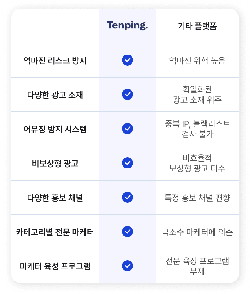텐핑은 광고주가 원하는 성과를 달성할 수 있도록 매체별로 최적화된 마케터를 연결해 주는 플랫폼입니다.